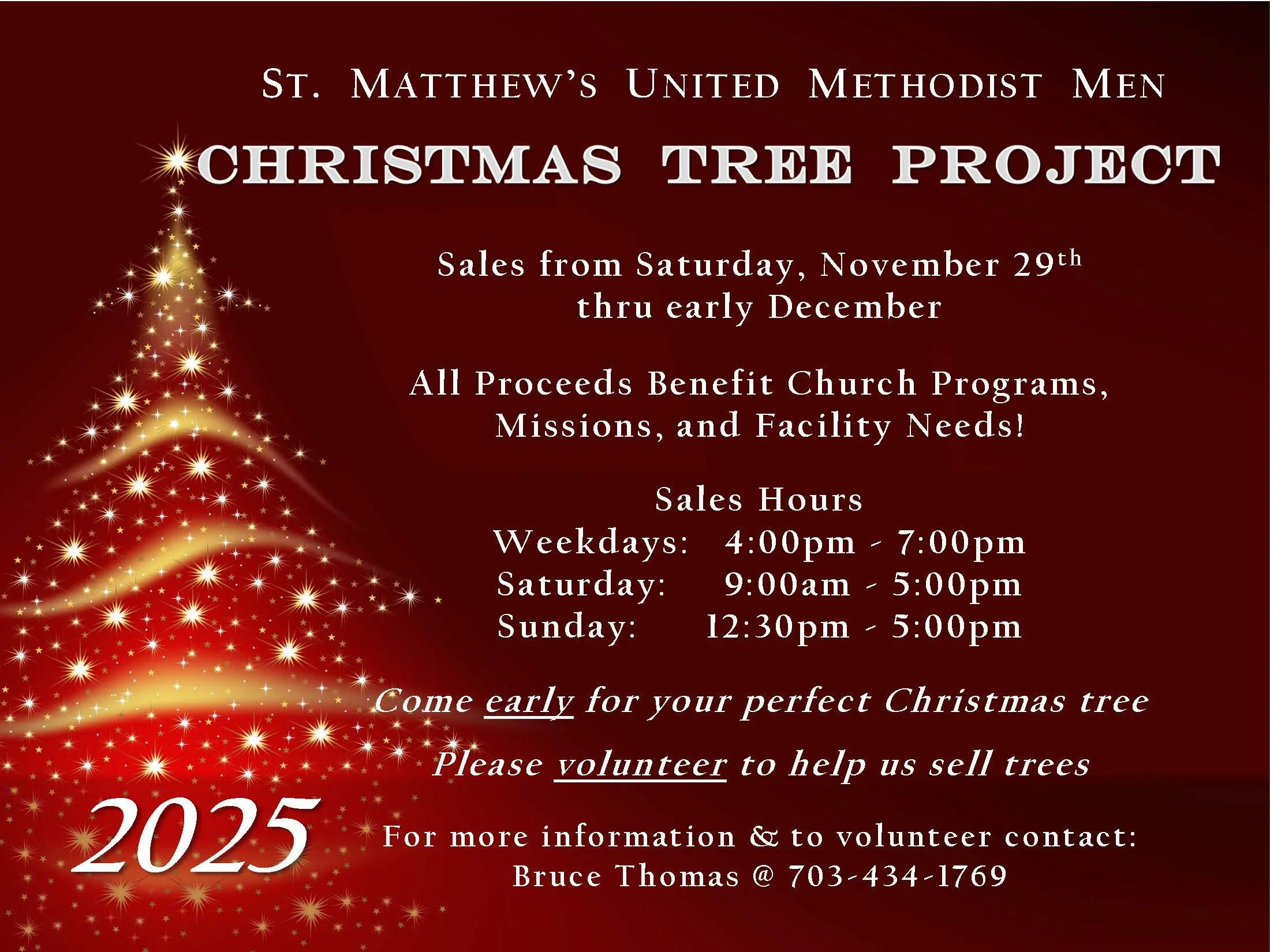UMM will be leading a group of volunteers selling Christmas trees at St Matthews UMC. Christmas trees will be arriving this month at St Matthews UMC.